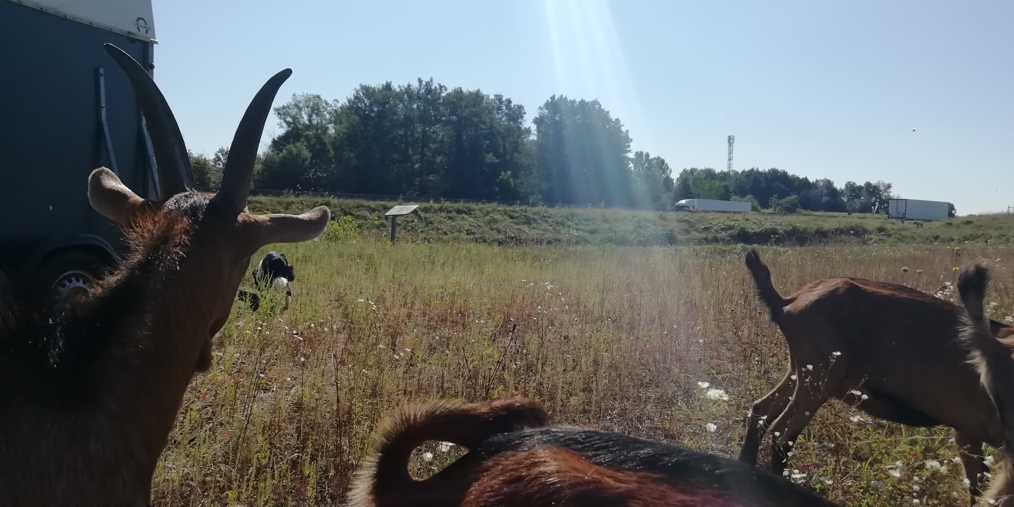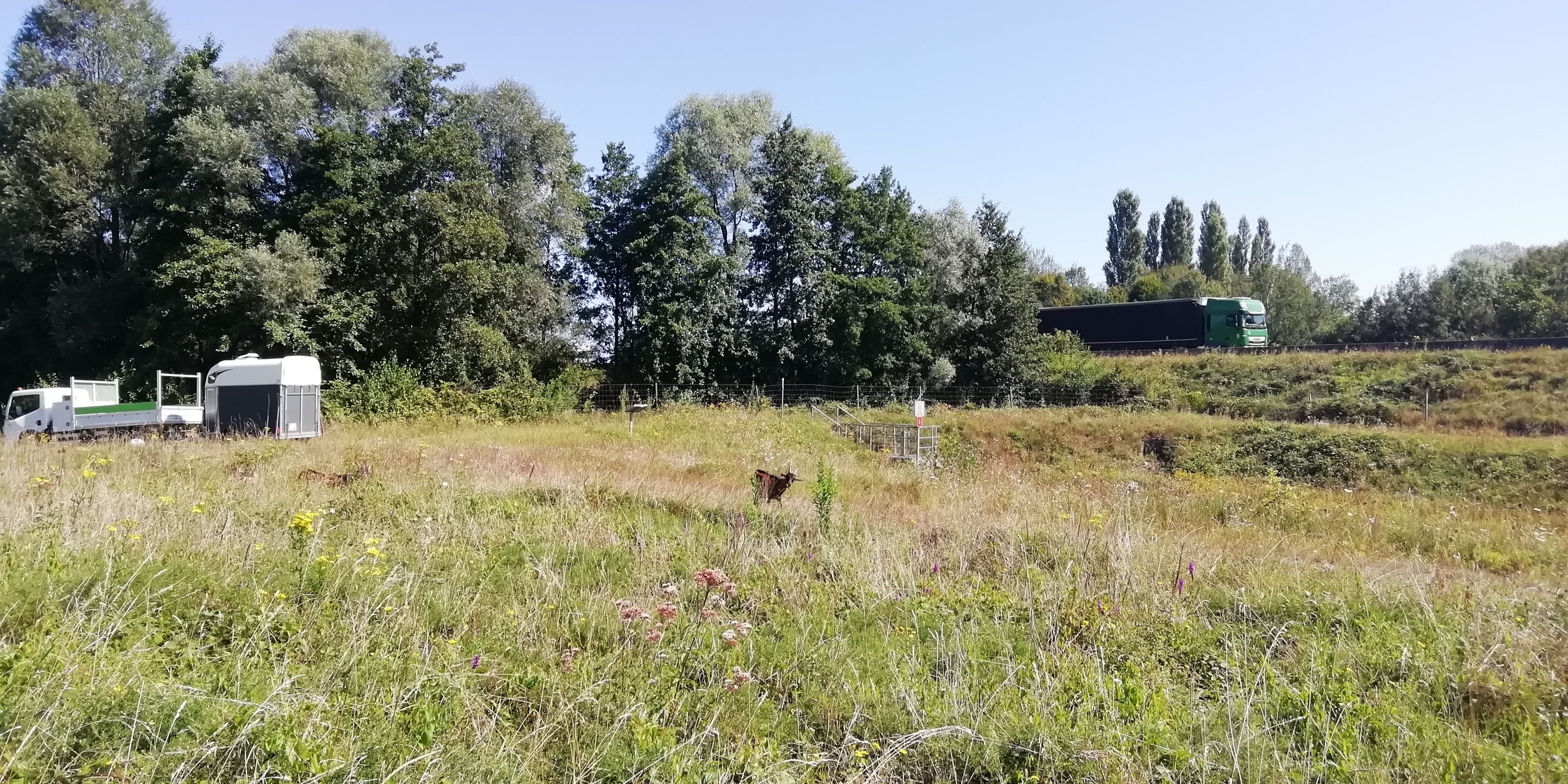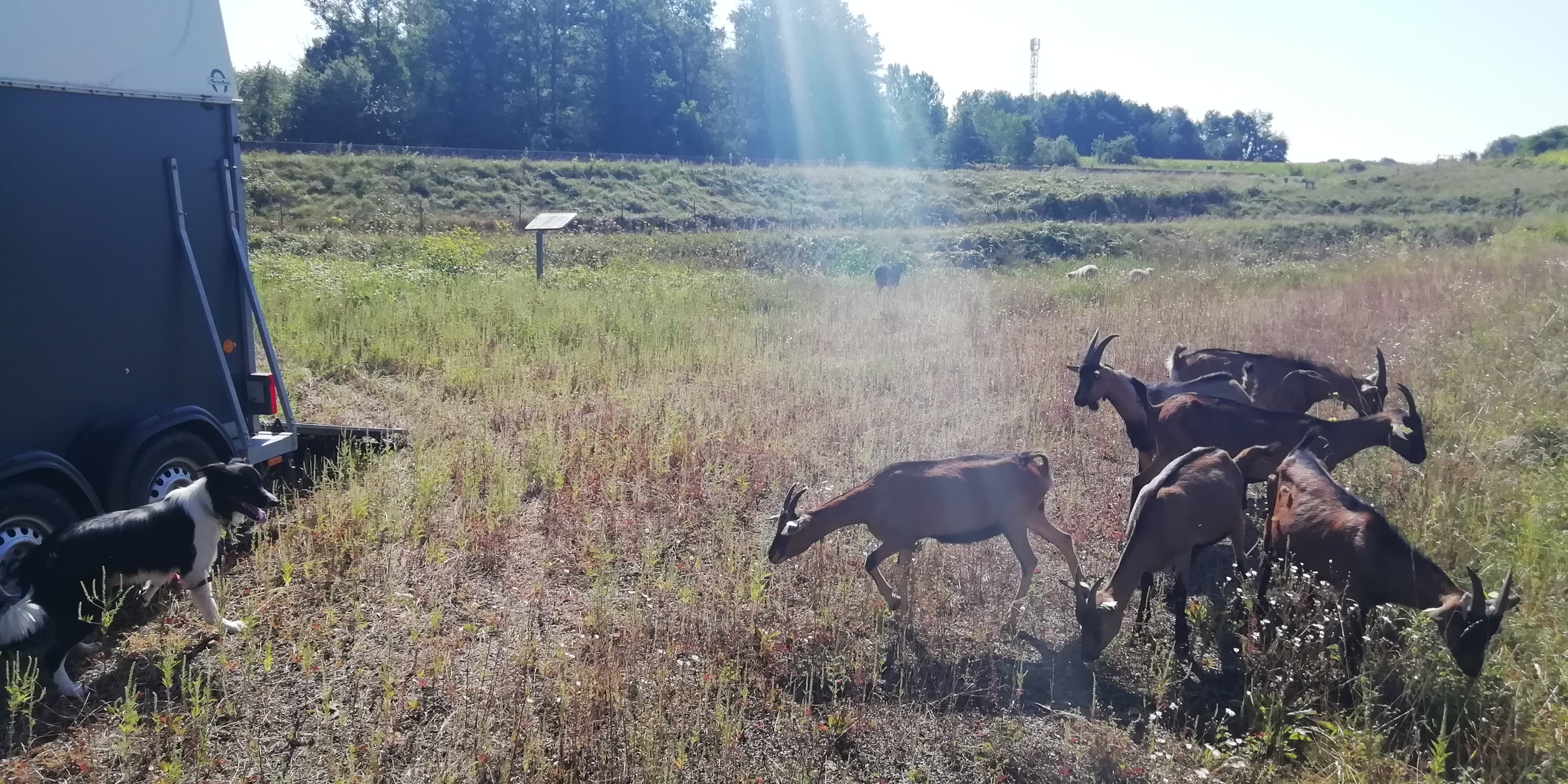 Nous venons d’être missionnés le mois dernier par les autoroutes APRR pour entretenir des bassins sur tout le Jura. Nous avons ciblé ensemble les bassins selon les spectres du bien-être animal puis des objectifs écologiques et économiques. Le choix des animaux en a ensuite découlé. Les sites historiquement entretenus mécaniquement, sont de plus en plus envahis par des espèces invasives (ici Ambrosia artemisiifolia / Ambroisie annuelle, Ambroisie à feuilles d’armoise). Nous avons programmé un ordre de passage en fonction de la « gravité » des colonisations et le stade de développement végétatif. Le premier bassin est déjà terminé et le premier retour sur les invasives est plus que satisfaisant! Les animaux ont tout consommé avant le stade de propagation. Premier objectif atteint! Nous en saurons plus au printemps prochain quant à l’effet à plus long terme de ce pâturage en observant comparativement la densité de repousse. Les bassins étant souvent difficiles d’accès, les ligneux ont aussi colonisé fortement les milieux. Nos biquettes envoyées en première ligne s’en sont occupées très volontiers! Les moutons s’occupent eux des herbacées des zones anciennement fauchées. Ils sont venus remplacer 2 tracteurs et 3 débroussailleuses pour gérer ces zones, et pour combien de litres de carburants économisés??