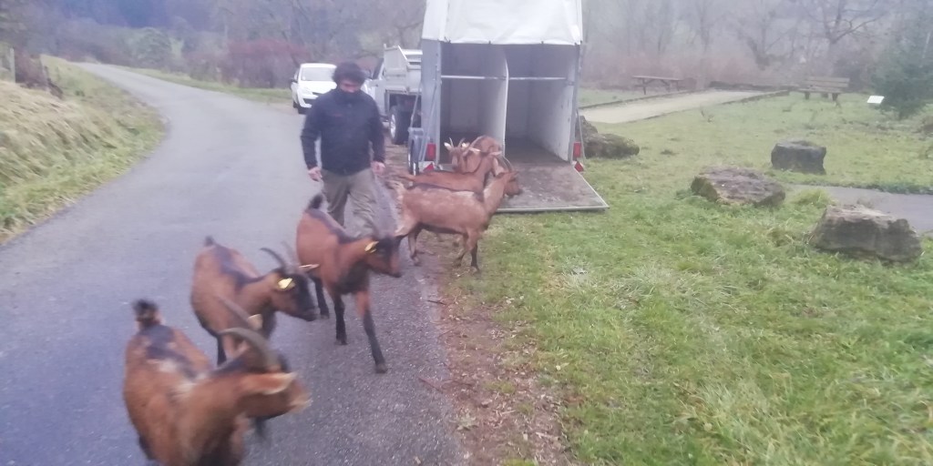 Aujourd’hui commence une nouvelle aventure pour nos biquettes. Nous rencontrions le mois dernier »Nos jardins imparfaits » au forum des associations de LONS-LE-SAUNIER / Festival REGAIN. Nous nous sommes très vite bien entendus avec des projets/valeurs communes, en plus nous nous sommes aperçu que nous étions voisins! Petits producteurs locaux de spécialités culinaires à base de fruits et plantes aromatiques de notre beau Jura, leur vision de l’agriculture nous à immédiatement plu. Entreprise éthique en plein développement, ils viennent d’obtenir un nouveau terrain qu’il faut défricher cet hiver pour préparer les plantations de ce printemps. Une belle rencontre qui aboutit sur un chantier idéal pour nos biquettes, et peut-être de futurs partenariats pour accompagner les services que nous proposerons à nos clients ! Merci à »Nos jardins imparfaits » pour leur confiance…Nous savons qu’elles seront bien avec vous ![]()