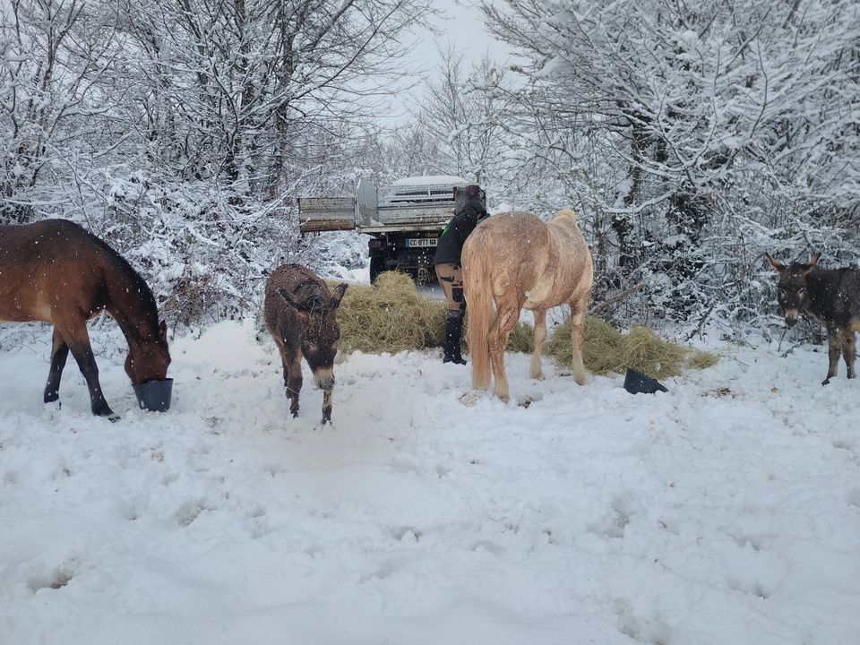 Nous devons donc leur apporter du foin en quantité, vérifier les clôtures et les redresser le cas échéant, vérifier les bacs d’eau et casser la glace, vérifier que tout le monde va bien. Et celà, deux à trois fois par jour.